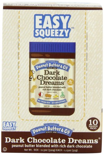 Peanut Butter and Co dark chocolate dreams squeeze packs, comes in 1.15 ounce pouch. It's all natural peanut butter blended with rich dark chocolate. It's like a peanut butter cup in a jar. Great on a sandwich, but just as wonderful spooned over ice cream, spread on fruits, or simply eaten out of the jar. It's equally delicious as an ingredient in your all-time favorite baked goodies like chocolate cake and bread pudding. It contains no cholesterol, no trans fats, no hydrogenated oils, and no high-fructose corn syrup. It is also gluten-free, certified vegan, and certified kosher pareve by the orthodox union. The shelf life is 6 months after opening, if stored in a cool, dry place. It introduced a new line of all-natural baking mixes as well as peanut butter packets that you can enjoy on the go.