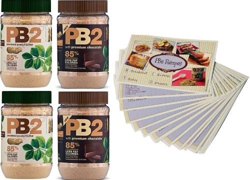Powdered Peanut Butter - 85% Less Fat and Calories - 4 Pack - 2 PB2 Jars and 2 PB2 Cocoa Jars - 6.5oz Each - Free Bonus PB2 Recipe Cards Included : Through a unique process created by Bell Plantation that does not involve the use of any chemicals; over 90% of the fat is removed from the peanut. Essentially the oil is squeezed out of roasted peanuts and what remains is a peanut powder. The resulting all-natural product is unbelievable!The possibilities for PB2 are limited only by the users imagination and creativity! An outstanding natural protein source sprinkle on shakes, yogurts, smoothies, great for outdoor sports. Excellent for ice cream as it will not seize while processing, ganaches, frostings, truffles, soufflés, cakes, muffins, brownies. Dissolves easily for savory applications- Asian noodle sauces, breadings and crust especially for seafood. It is also wonderful for baking either reconstituted or as a powder. This listing includes 16 Free Bonus PB2 Recipe Cards! We've thoughtfully included some of our favorite recipes - Everything from breakfast, entrees, desserts and even sides!